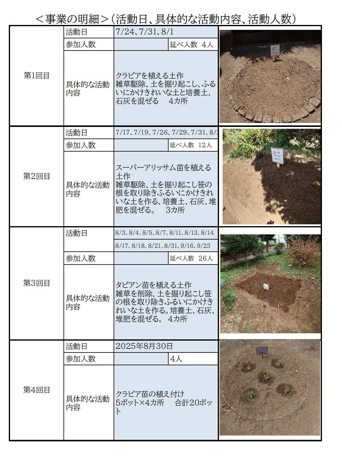 <事業の詳細>(活動日、具体的な活動内容、活動人数)
