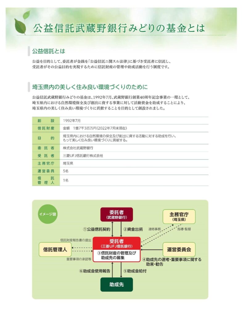 公益信託武蔵野銀行みどりの基金は、埼玉県内における自然環境保全および創出に資する活動を行う個人または団体等の皆さまのご活動資金の一部を助成するものです
